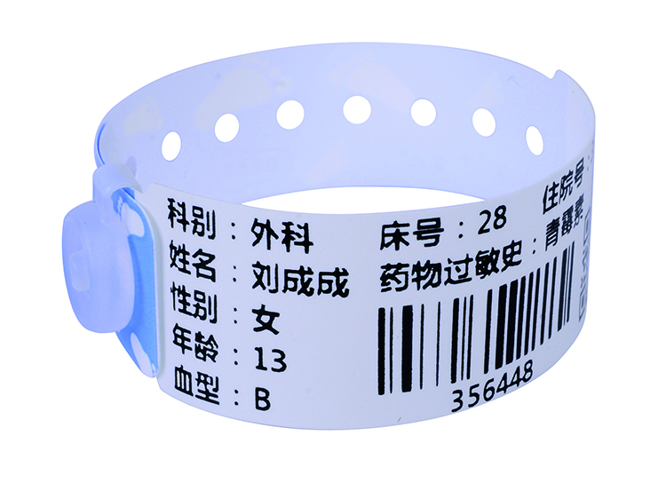 婴儿识别腕带表面打印有婴儿身份资料,腕带可随手腕的粗细调节腕带长度,腕带一端可搭配一次性不可逆软扣,一经扣上就不能随意拆除或调换,腕带材质良好,无毒无味,柔软光滑,抑菌防水,打印效果清晰持久,遇水受摩擦字迹不退色不模糊,使用期间无皮肤过敏或损伤情况。