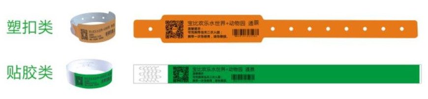 在游乐场的应用中,通过腕带打印机打印出携带二维码的一次性识别手腕带,佩戴于游客手腕上。目前主流的二维码手腕带采用纳米硅材质,柔软耐撕,热敏打印快速清晰。二维码由智能门票云系统后台生成,包含了门票规则。